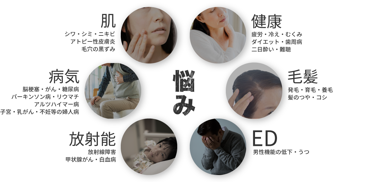 | その他 | 自己免疫疾患・膠原病・リウマチ・アレルギー・花粉症・痛風・歯周病・蓄膿症・頭痛・不眠症・冷え性・アレルギー性鼻炎・便秘・疲労・筋肉痛・口内炎・口臭・放射能による健康被害の軽減 |