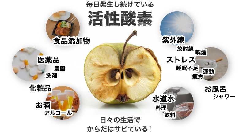 私たちは呼吸によって取り入れた酸素のうち、約2%が活性酸素になると言われ、太陽からの紫外線や放射線、食物に含まれる添加物、運動や疲労・ストレス、さらにはお風呂や調理時で使う水道水を使用していてるだけでも、多くの活性酸素が体内で作られています。